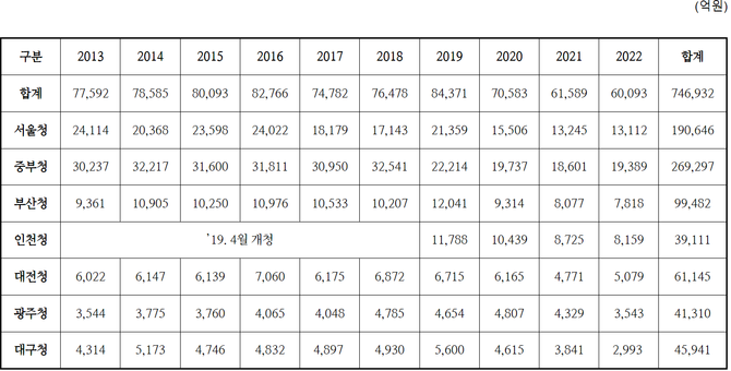 지난 10년간 중부청이 26조9297억원으로 가장 많았고, 서울청이 19조646억원으로 뒤를 이었다. 인천청도 3조9111억원에 달했다. 이들의 비중은 66%를 넘었다.