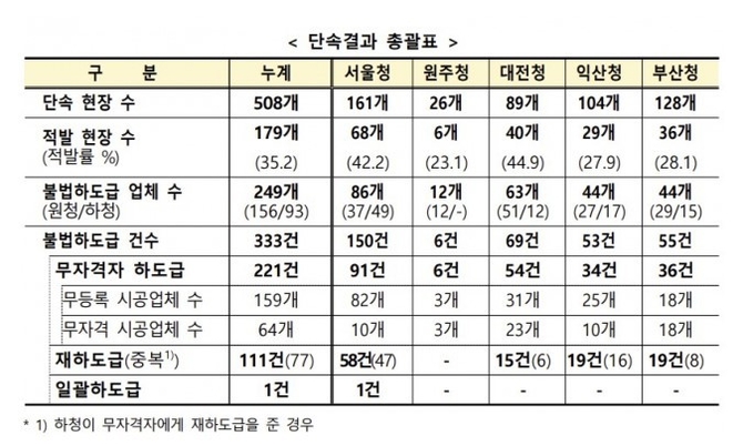 이번 집중단속을 통해 건설사가 근로자에게 직접 지급한 임금 비중이 현저히 낮은 공공 273개, 민간 235개 등 508개 현장을 조사한 결과, 179개 현장(35.2%)에서 249개 건설사의 333건의 불법하도급을 적발했다. 무자격자 불법하도급이 221건(66.4%)으로 가장 많았고 재하도급 111건(33.3%), 일괄하도급 1건(0.3%)이 뒤를 이었다.