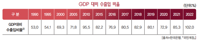 한국은 GDP에서 차지하는 수출입의 비율이 가히 압도적인 나라다. OECD 자료에 따르면 2020년 기준 한국의 GNI1) 대비 수출입 비율은 72.3%이다. 미국의 31.4%, 일본의 37.5%, 프랑스의 66.1%에 비해 상당히 높다. 즉 수출이 많지 않다는 것은 우리 경제에 빨간 불이 들어왔다는 경고등이다.