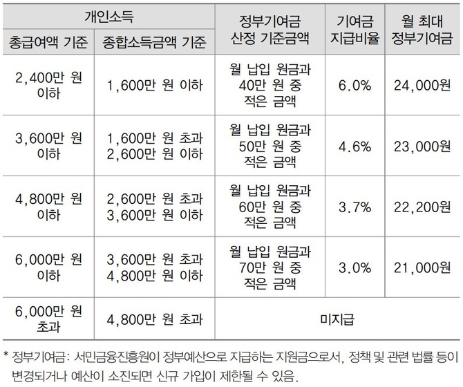[서민금융진흥원의 정부기여금 지급 기준과 금액]