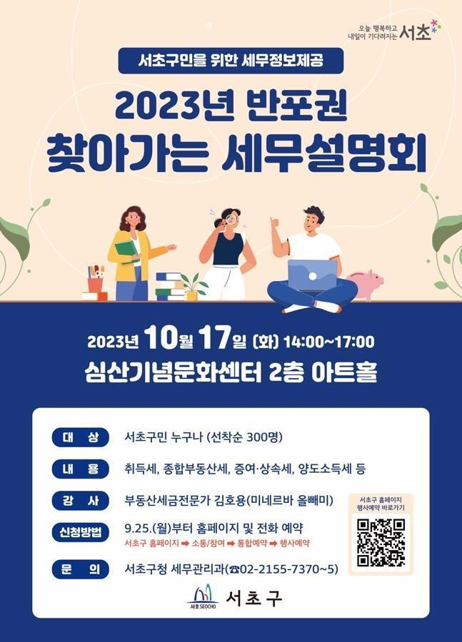 서초구는 10일 세금과 관련한 구민 궁금증을 덜어주기 위해 '2023년 반포권, 찾아가는 세무설명회'를 지난 4월 서초권, 6월 방배권 설명회에 이어 오는 17일 오후 2시 심산기념문화센터에서 개최한다고 10일 밝혔다.