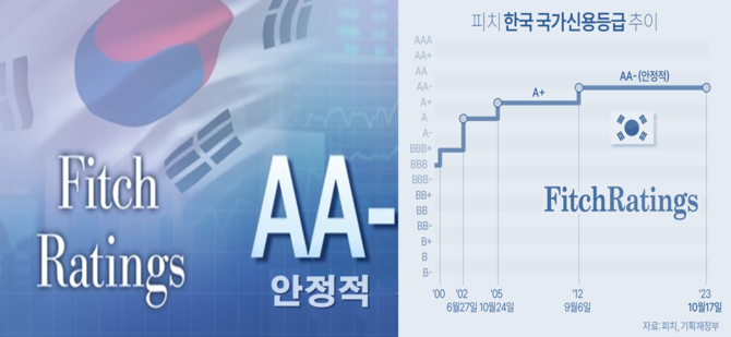 기획재정부는 17일 피치는 2012년 한국의 국가신용등급을 'A+'에서 'AA-'로 상향 조정한 뒤 같은 등급을 유지하고 있다고 밝혔다.