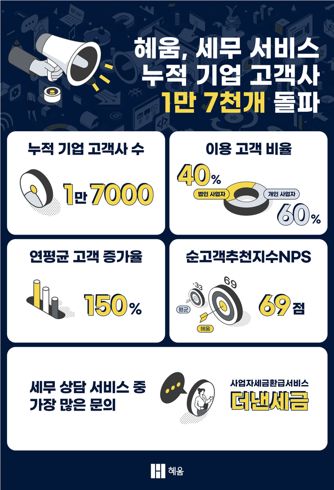 혜움 이재희 대표는 “사업가를 돌본다는 사명감으로, 세무사와 고객들에게 필요한 IT인프라를 활용해 세무 서비스를 제공하고 있다"며 “앞으로도 세무사들이 양질의 세무 서비스를 제공할 수 있도록 혜움랩스와 협력해 고객 만족을 높이는데 최선을 다하겠다”고 전했다.