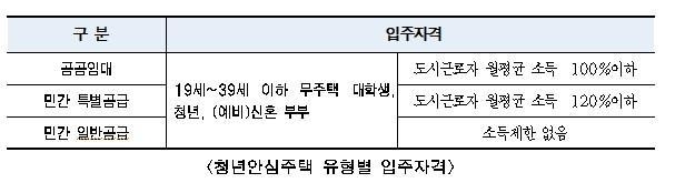 공공임대 주택의 경우 만 19∼39세 무주택자인 청년 또는 신혼부부 중에서 부모 합산 도시근로자 가구원수별 가구당 월평균 소득 100% 이하에 해당하면 신청할 수 있다.