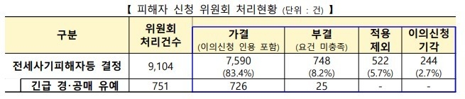 그간 위원회에서 최종의결한 전세사기피해자등 가결 건은 총 7590건이다. 긴급 경・공매 유예 협조요청 가결 건은 총 726건이다.