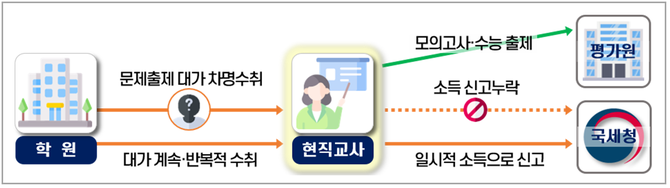 이들은 학원에 문제를 판매하고, 그 대가를 가족계좌 등으로 받으면서 개인소득세 누진과세를 회피했다.