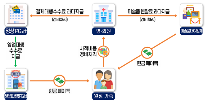 이렇게 부풀린 지급 수수료 중 일부는 원장 가족이 현금 페이백으로 받았으며, 미술품 대여업체 〇〇〇의 탈세영업에 가담하여 미술품을 대여하면서 렌탈료는 병·의원 경비처리했다.