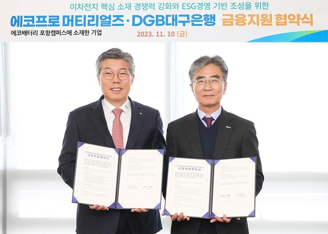 에코프로머티리얼즈는 지난 10일 DGB대구은행과 '이차전지 핵심소재 경쟁력 강화 및 ESG(환경·사회·지배구조) 경영 기반 조성을 위한 금융지원 협약(MOU)'을 체결했다고 12일 밝혔다.