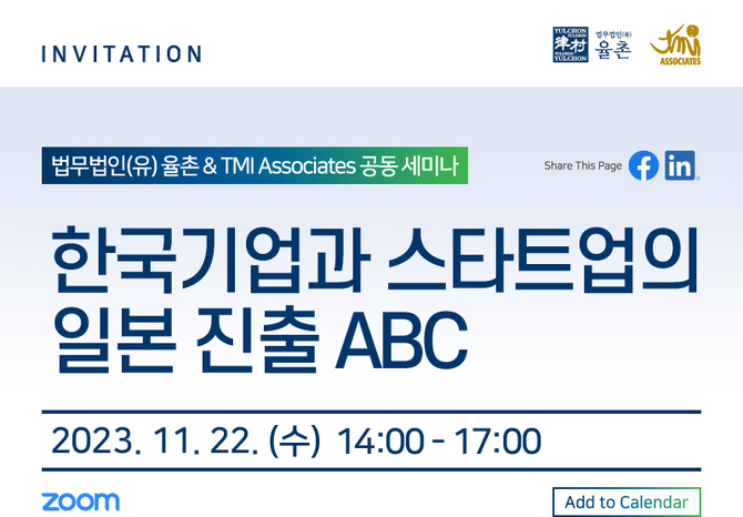 (조세금융신문=고승주 기자) 법무법인 율촌이 오는 22일 오후 2시 일본의 TMI종합법률사무소(TMI&Associates)와 함께 한국기업과 스타트업의 일본진출 웨비나 ABC를 개최한다.