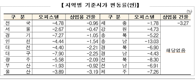 기준시가안 가운데 오피스텔은 전년 대비 평균 4.78%, 상업용 건물은 0.96% 각각 하락했다.