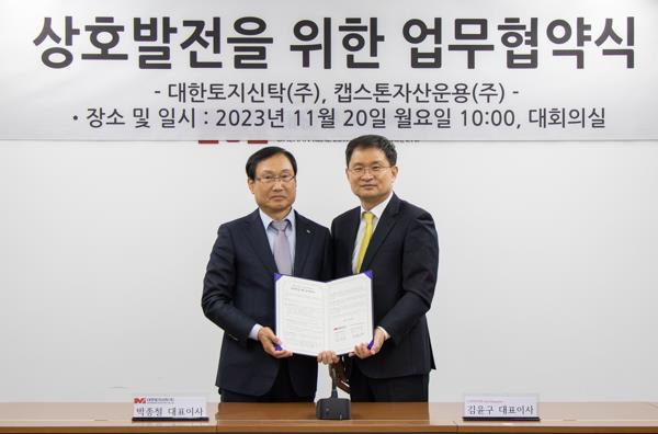 (조세금융신문=구재회 기자) 대한토지신탁은 21일 부동산 투자 및 운용을 전문으로 하는 자산운용사인 캡스톤자산운용과 부동산 금융 관련 상호 협력을 위한 업무협약(MOU)을 맺었다고 밝혔다.