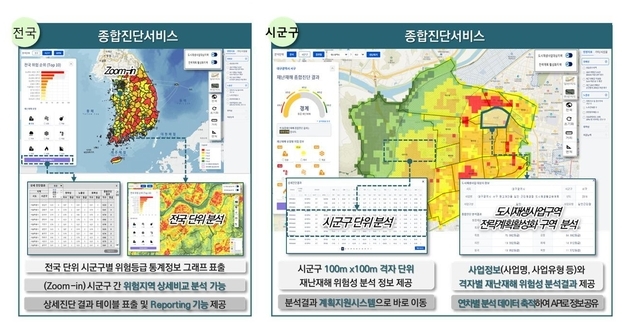 특히 진단시스템은 기존 집계 단위보다 작은 격자 단위(100m)로 구축돼 보다 정확한 데이터를 제공할 수 있고, 전 국토의 위험도에 대한 상시DB를 활용할 수 있어 분석 시간과 비용을 절감할 수 있다. 계획수립 지원시스템은 재해 발생 위험성이 높은(1~2등급) 지역에 재난 발생 시 피해를 저감할 수 있는 방안을 제시한다.