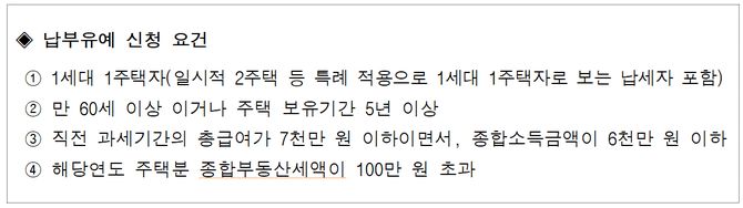 1세대 1주택자 중 고령자 또는 장기보유자 가운데 종부세가 100만원이 넘고 연간 소득이 일정 이하인 경우 납부유예를 신청할 수 있다. 신청기한은 12월 12일까지다.