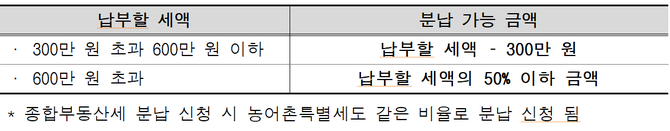 분납 조건은 종부세(농어촌특별세 포함)가 300만원을 초과하는 경우 등이며 분납기한은 2024년 6월 17일까지다.