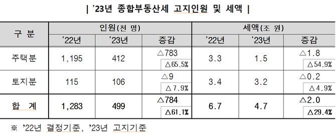 올해 종부세 주택분은 41만2000명, 1조5000억원으로 지난해보다 인원은 78만3000명, 세액은 1조8000억원 줄었다.