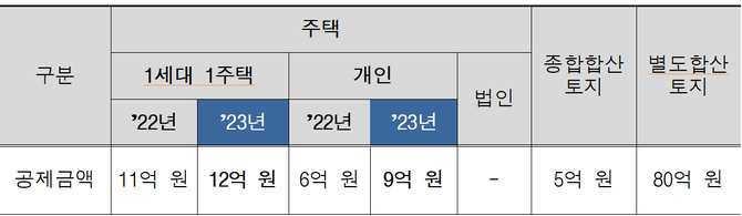기본공제의 경우 1세대 1주택자는 11억원에서 12억원으로, 그 이상 다주택자는 6억원에서 9억원으로 올랐으며, 이에 따라 공시가격 18억원 이하 공동명의 주택은 1주택자 혜택을 받을 수 있다.