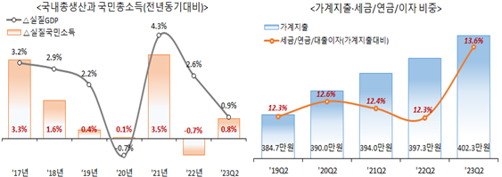 고물가 충격으로 가계의 실질소득은 역주행의 길로 접어들었다. 실질국민소득은 2022년 –0.7% 마이너스 성장을 기록했으며, 올해 상반기에도 0.8% 성장에 그쳤다. 이는 올해 1%대의 경제성장률에도 미치지 못하는 수준이다. 따라서 민생경제는 공공발 물가대란 사태가 불거진 2022년부터 사실상 성장을 멈춘 것이나 다름없다.