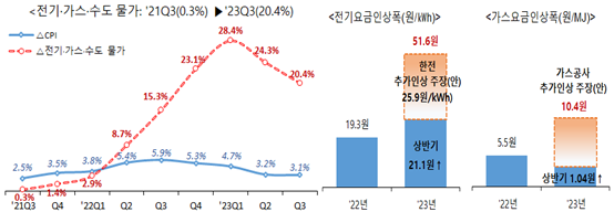 더욱이, 유례없는 고물가 국면이 장기화되면서 물가충격이 점차 취약계층에서 중산층과 서민으로 확산되는 추세다. 이처럼 인플레이션 압력이 높은 상황에서 정부는 미친 듯이 공공요금을 올린 바 있다. 한번 올리면 두 자릿수 인상은 기본이고, 잠시 숨 고르기에 들어갔지만, 지금까지도 이러한 인상 기조를 유지하고 있다.