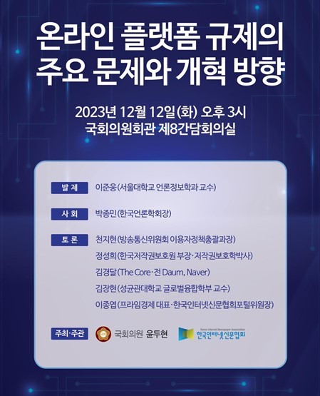 한국인터넷신문협회와 윤두현 의원실(국민의힘 미디어커뮤니케이션특별위원회 위원장)은 12일 국회의원회관 제8간담회의실에서 ‘온라인 플랫폼 규제의 주요 문제와 개혁 방향’을 주제로 공동 토론회를 개최했다.