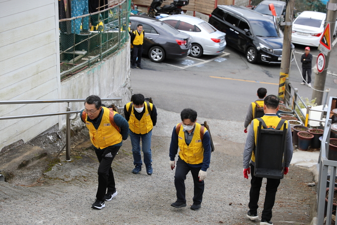 이날 장일현 부산국세청장 및 직원 50여명은 직접 지게를 지고 연탄 1500장을 연탄이 필요한 가구에 직접 전달했다.