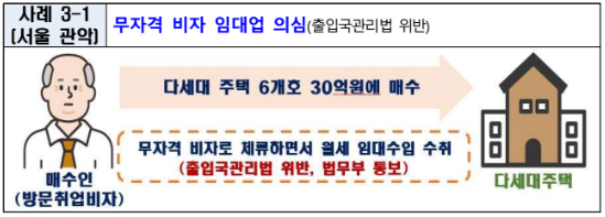 #방문취업 비자(H2)로 체류하는 외국인 D씨는 지난 7~9월 동일단지 다세대 주택 6개호를 약 30억원에 일괄 매수하고 월세를 받는 등 임대업을 영위한 사실이 확인됐다. 이에 무자격비자 임대업 혐의로 법무부에 통보됐다.