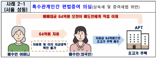 #외국 국적의 매수인 C씨는 서울 성동구 소재 초고가 주택을 64억원에 사들이면서 거래대금 전액을 모친에게 차용해 조달했다. 대금 64억원은 모친이 매도인에게 직접 이체했다. A씨는 차용증을 작성했다고 소명했지만 차용증 및 이자 지급 내역이 확인되지 않아 편법증여가 의심돼 국세청에 통보됐다.