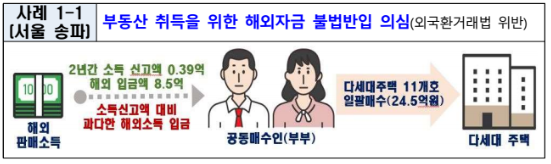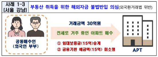 #공동매수자 B씨 부부는 아파트 전세 세입자로 거주하다가 해당 건물을 30억원에 매수했다. 이 매수자들은 기존 전세보증금 및 금융기관 예금액으로 자금을 조달했다고 했지만 금융기관 예금액 15억원에 대한 자금출처가 확인되지 않아 해외자금 불법반입이 의심돼 관세청에 통보됐다.