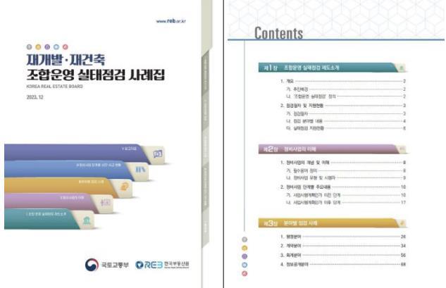 정비사업 단계별 주요 내용, 실태 점검 분야별 적발사례, 사건·사고에 따른 판례 및 주요 질의회신 등이 수록됐으며 실태 점검에 따른 처분·조치 사항도 확인할 수 있다.