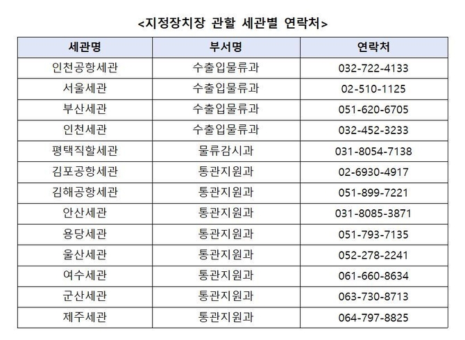 문의사항은 관세청 통관물류정책과 또는 지정장치장이 소재하는 관할세관으로 문의하면 된다.