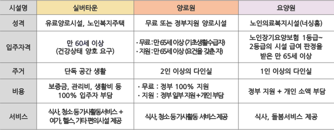 실버타운은 양로원, 요양원과 달리 각 실버타운의 입주자 요건에 부합하면서(보증금 등), 만 60세 이상이고, 건강한 사람이라면 누구나 입주할 수 있습니다.