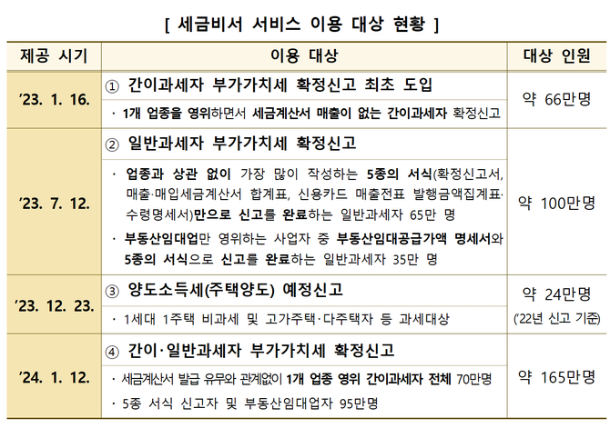 국세청은 지난해 1월 1개 업종을 영위하면서 세금계산서 매출이 없는 간이과세자 부가가치세 확정신고에 세금비서 서비스를 최초 제공한 이래 7월에는 일반과세자 부가가치세 신고, 12월 주택 양도소득세 예정신고까지 확대했다.