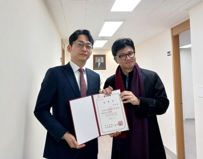 한동훈 국민의힘 비대위원장은 이날 오후 경기도 수원시 장안수 경기도당사에서 전정일 예비후보에게 임명장을 전달했다.