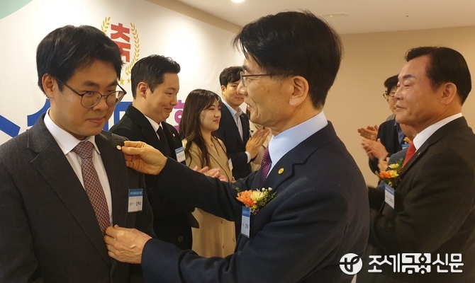 선배 세무사들의 축하 메시지에 이어서 제60기 임해수 동기회장과 윤상열 부회장에게 꽃다발과 세무사 배지가 전달됐다.