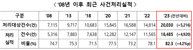 연간 심판 사건 처리율은 2013년 75.3%, 2018년 71.5%, 2022년 78.1%로 70%대를 기록하고 있었으며, 지난해 82.3%로 뛰어오르면서 처음으로 80%대를 넘겼다.