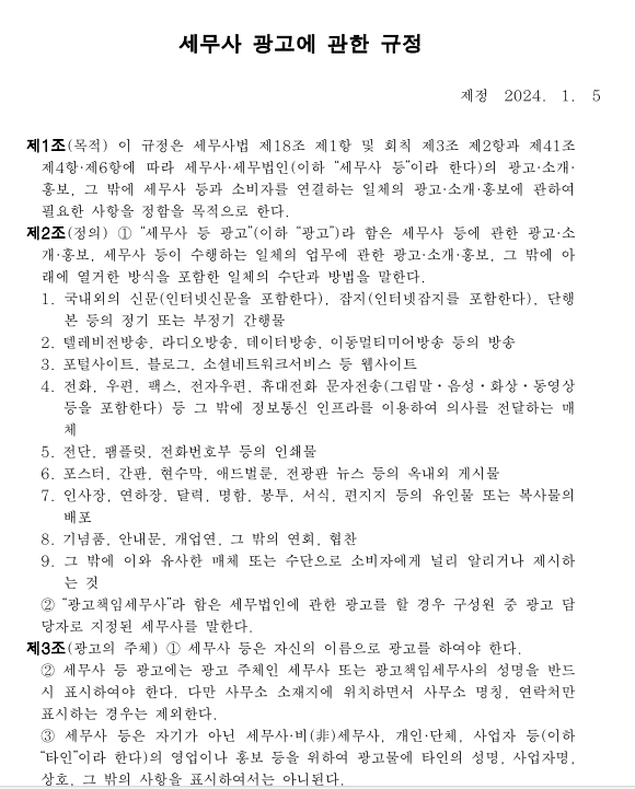 제정된 세무사 광고규정에서는 세무사와 납세자를 직간접적으로 연결하는 일체의 광고, 소개, 홍보와 관련된 광고를 대상으로, 광고 수단과 방법, 제한되는 광고내용과 방법, 광고를 심사하는 세무사광고심사위원회의 설치·운영, 위반행위에 대한 조치 등을 상세하게 정하고 있다.