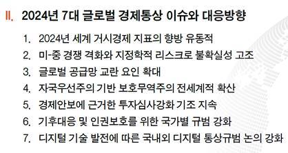 ‘2024년 7대 글로벌 경제통상 이슈와 대응방향’ 이슈브리프(2024년 제1호)는 올해는 세계 거시경제 지표의 향방이 유동적이라고 전망했다.