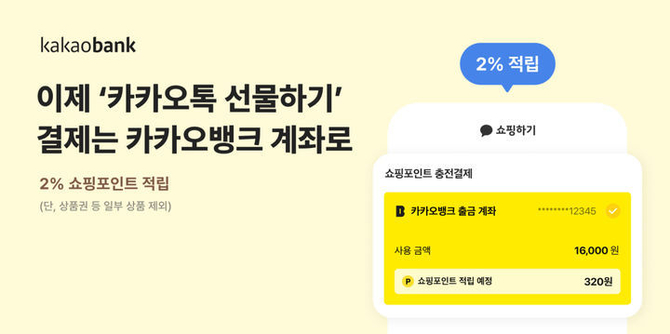 카카오뱅크 계좌로 결제하는 고객들은 실제 결제 금액의 2% 상당의 쇼핑포인트를 받는다. 쇼핑포인트는 받은 날부터 1년 동안 쓸 수 있다. 현금성 상품권 등 일부 상품의 경우 쇼핑포인트가 적립되지 않으며 혜택 내용은 향후 변동될 수 있다.