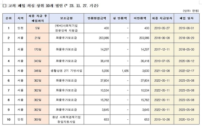 보조금을 지급받은 후 가장 빠른 시일 내에 폐업한 법인은 인천광역시 (예비)사회적기업 전문인력 지원금을 받았던 곳이다. 해당 법인은 최종 보조금을 지급받은 후 5일 만에 폐업했다. 인천시청은 반환금 400만원을 명령했지만 4년 간 한 푼도 반환되지 않아 결국 결손처분 한 상태이다.