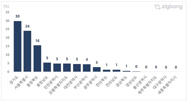 그 다음으로 ▲충청남도(5%) ▲강원도(5%) ▲대전시(5%) ▲부산시(4%) ▲광주시(3%) 등이 3%~5%의 청약통장 사용을 이끌어 냈다. 반면 ▲전라북도(1%) ▲전라남도(1%) ▲경상북도(1%), ▲경상남도 ▲울산시 ▲제주도 등지는 비교적 낮은 청약수요을 보였다. 한편 대구시는 지역내 쌓인 미분양(2023년 11월 기준 1만328가구) 우려로 신규 공급이 씨가 마르며 달성군 다사읍 '대실역블루핀34' 1개 사업장 분양에 그쳤고 세종시는 지난해 아예 신규 분양에 나서지 않았다.