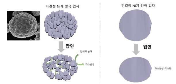 다결정 양극재는 여러 개의 입자가 뭉친 구조로 되어 있다. 배터리 제조 때 전극에 다결정 양극재를 압연하는데 강하게 할수록 에너지 밀도가 높아진다. 그런데 압연이 강해지면 다결정 양극재는 입자가 깨져서 가스가 발생하는 현상이 나타난다. 또한, 배터리 충·방전이 많아지면 리튬 이온이 이동을 반복하다가 다결정 양극재가 갈라지는데 이때도 가스가 발생한다. 가스가 발생하면 배터리 내부가 부풀어 오르는 현상이 생기고 전해액이 양극재와 닿으면서 화재가 발생한다.