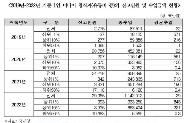 7일 기획재정위 소속 양경숙 의원이 국세청에서 받은 ‘1인 미디어 창작자(유튜버 등) 수입금액 현황' 자료에 따르면 2022년 기준 1인 미디어 창작자로 수입을 신고한 인원은 3만9366명이었다. 이들이 신고한 수입금액은 총 1조1천420억원을 기록했다. 1인당 평균 수입금액은 2900만원이었다.