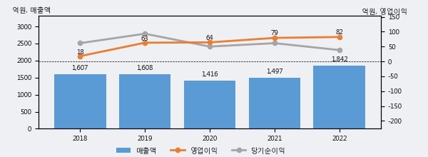 최근 실적을 살펴보면 2022년 매출액이 최근 5년 중 가장 높은 실적을 기록했음을 알 수 있다. 이전 최고 실적이었던 2019년 보다도 14.6%(234억 7천만원) 늘어난 것으로 나타났다.