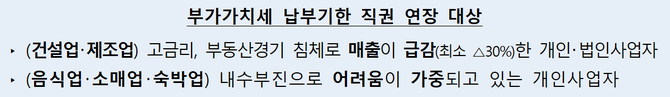 지난 1월 부가가치세 2기 확정신고 때 납부기한 2개월 직권 연장 대상(128.0만건)은 오는 3월 법인세 신고(5.2만건), 5월 소득세 신고(66.7만건)에 대해서도 납부기한 3개월 직권 연장 혜택을 받는다.