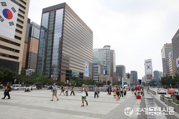 (조세금융신문=전한성 기자) '광복 70주년'을 십여일 앞둔 3일 오후 서울 종로구 세종대로 광화문광장 일대 고층빌딩에 대형 태극기가 곳곳에 걸려 있다.
