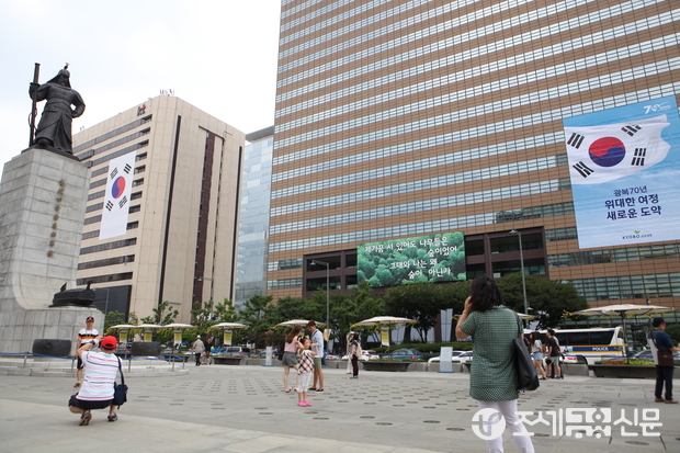 (조세금융신문=전한성 기자) '광복 70주년'을 십여일 앞둔 3일 오후 서울 종로구 세종대로 광화문광장 일대 고층빌딩에 대형 태극기가 곳곳에 걸려 있다.