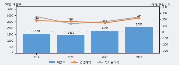 최근 실적을 살펴보면 2022년 매출액이 최근 4년 중 가장 높은 실적을 기록했음을 알 수 있다. 이전 최고 실적이었던 2021년 보다도 14.6%(261억 8천만원) 늘어난 것으로 나타났다.