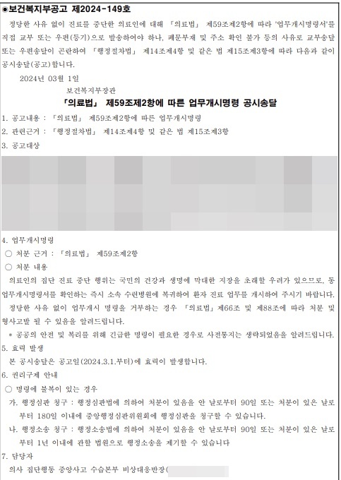 공고문은 "정당한 사유 없이 진료를 중단한 의료인에 대해 의료법 59조2항에 따라 업무개시명령서를 직접 교부 또는 우편(등기)으로 발송해야 하나, 폐문부재(문이 잠겨있고 사람이 없음) 및 주소 확인 불가 등의 사유로 교부송달 또는 우편송달이 곤란해 행정절차법에 따라 공시송달한다"며 대상자의 명단과 소속, 의사면허번호를 적었다.