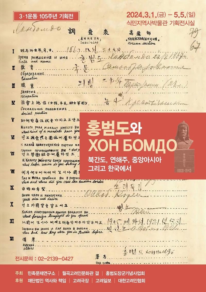 (조세금융신문=최주현 기자) 민족문제연구소는 3·1운동 105주년을 맞아 서울 용산구 식민지역사박물관에서 홍범도 장군의 삶과 독립운동을 담은 특별기획전 '홍범도와 ХОН БОМДО(홍범도)-북간도 연해주 중앙아시아 그리고 한국에서'를 연다.
