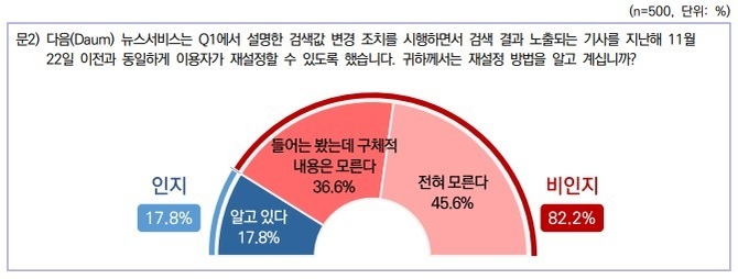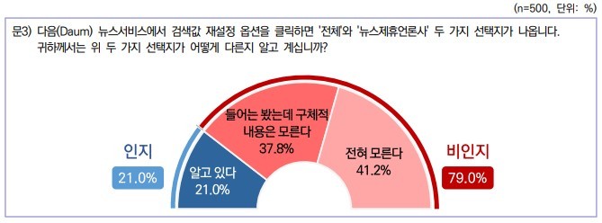 설문조사에서는 Daum뉴스에서 검색을 하면 146개 뉴스제휴 언론사와 1176개 검색제휴 언론사 기사가 함께 노출되던 것이 지난해 11월 22일 이후 146개 뉴스제휴 언론사 기사만 노출되는 것을 알고 있냐는 질문에 34%가 ‘전혀 모른다’고 답했고, 44.4%가 ‘들어는 봤는데 구체적 내용은 모른다’고 답했다. ‘알고 있다’는 응답은 21.6%에 그쳤다.