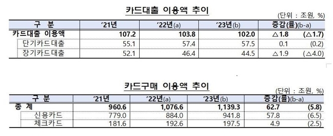 금융감독원이 18일 발표한 2023년 여신전문금융회사 영업실적(잠정) 자료에 따르면 지난해 신용·체크카드 이용액은 전년(1천76조6천억원)보다 62조7천억원(5.8%) 늘어난 1천139조3천억원으로 잠정 집계됐다.